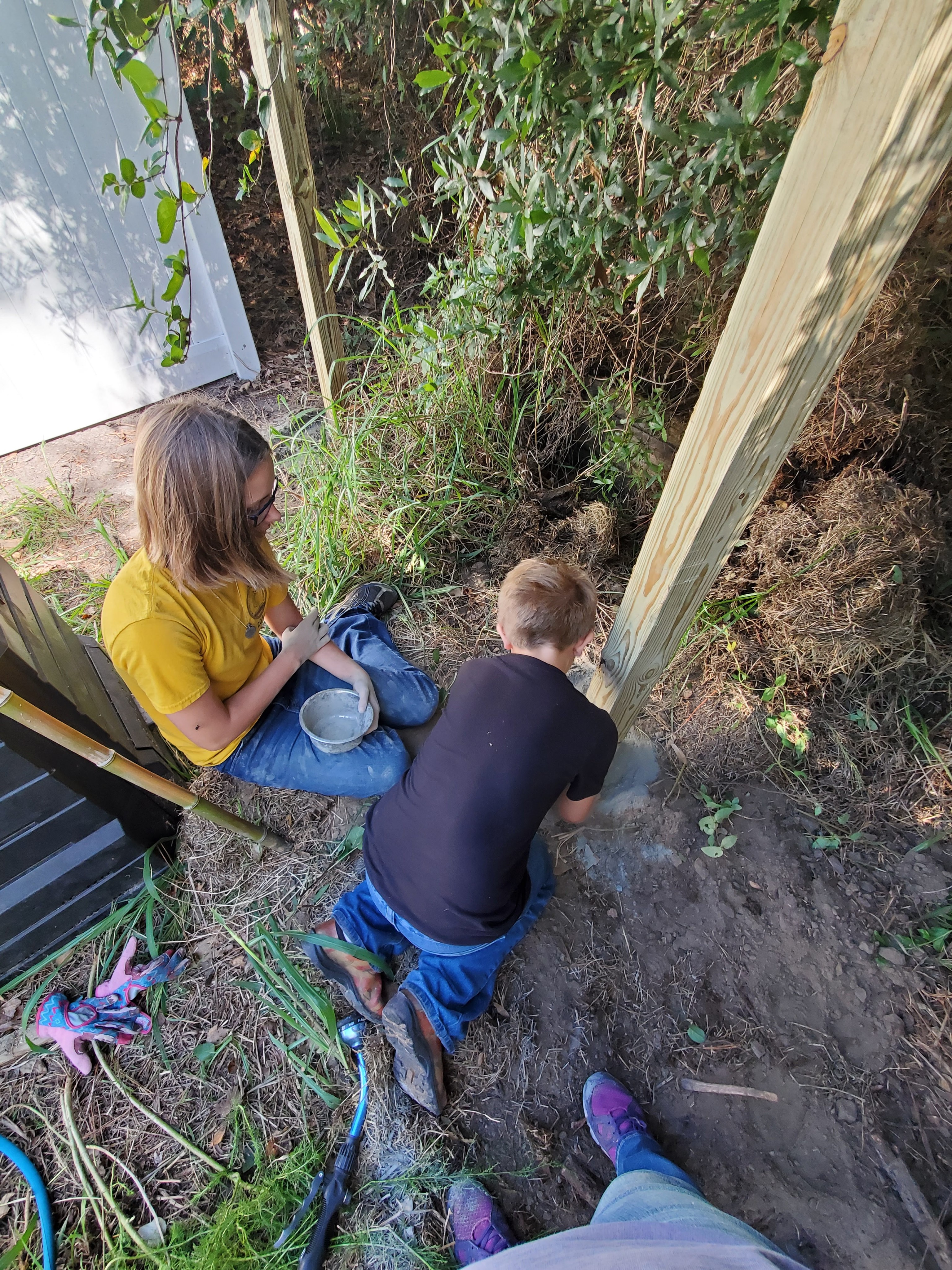 Once we were home everyone pitched in, and soon posts were in holes, and concrete was poured and tamped around them. Then it was time to wait and let it solidify.